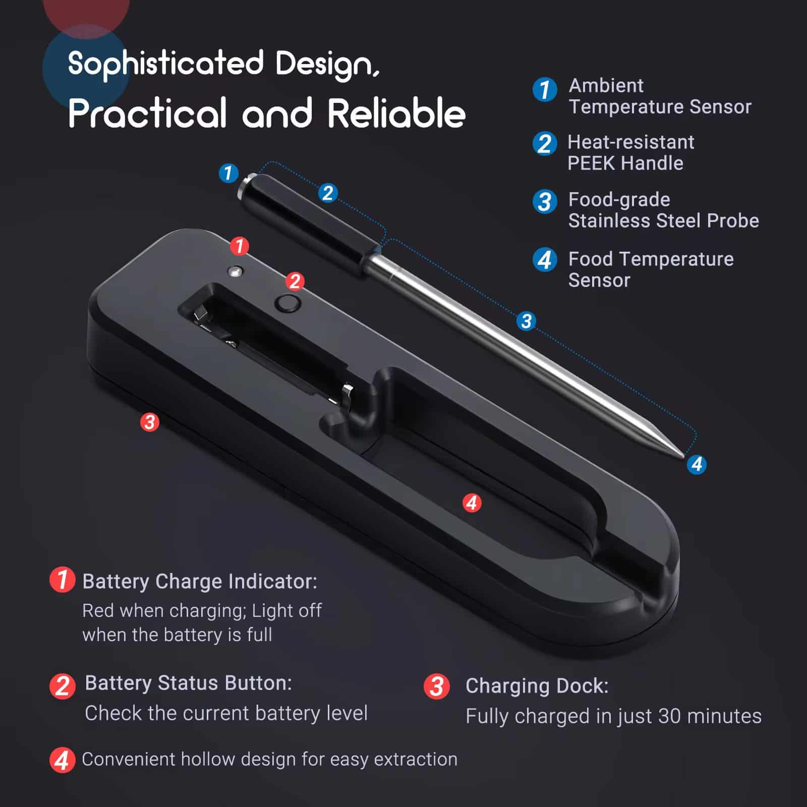 Simply wipe the probes with a damp cloth after each use. Avoid submerging them in water. The food-grade materials make cleaning quick and easy while maintaining hygiene.