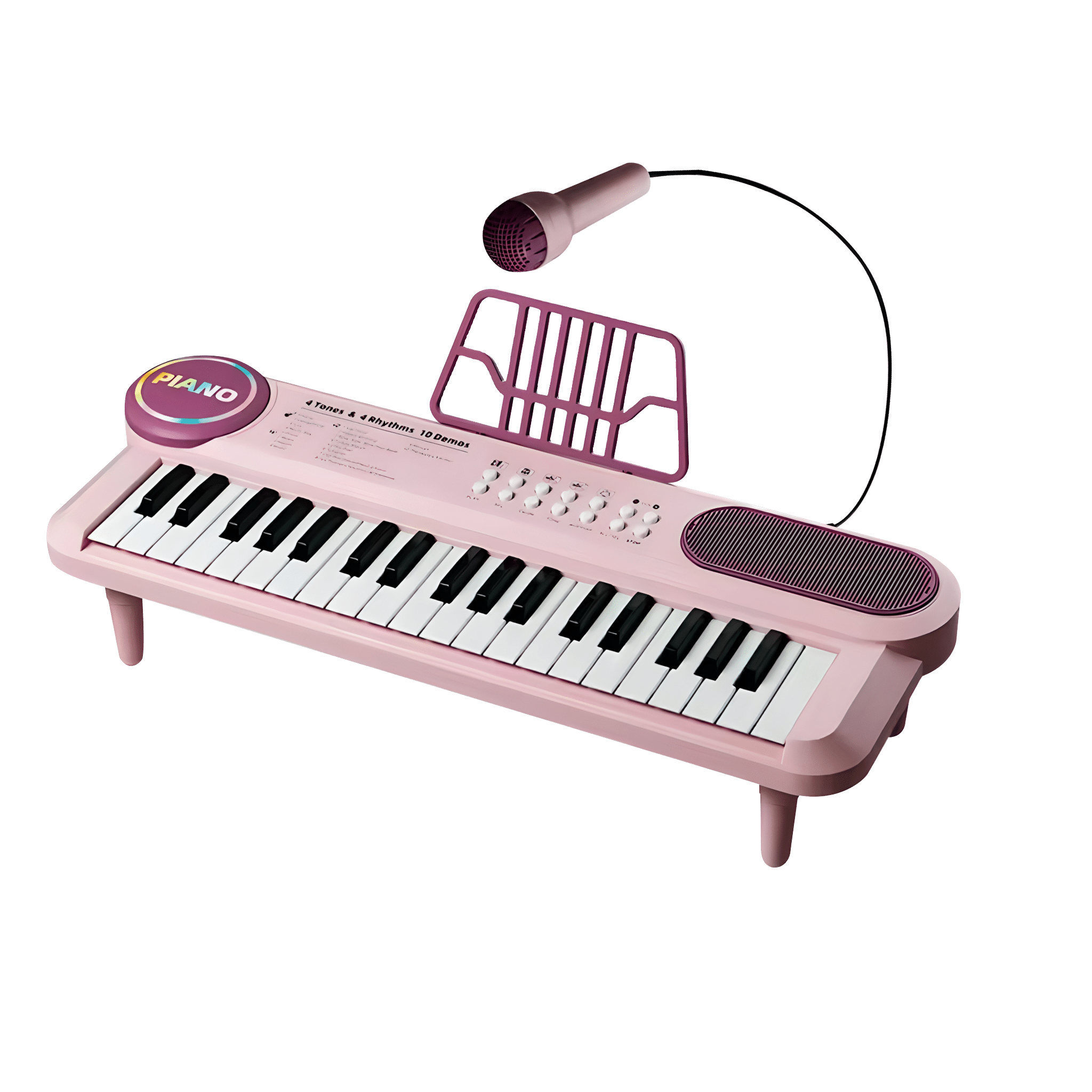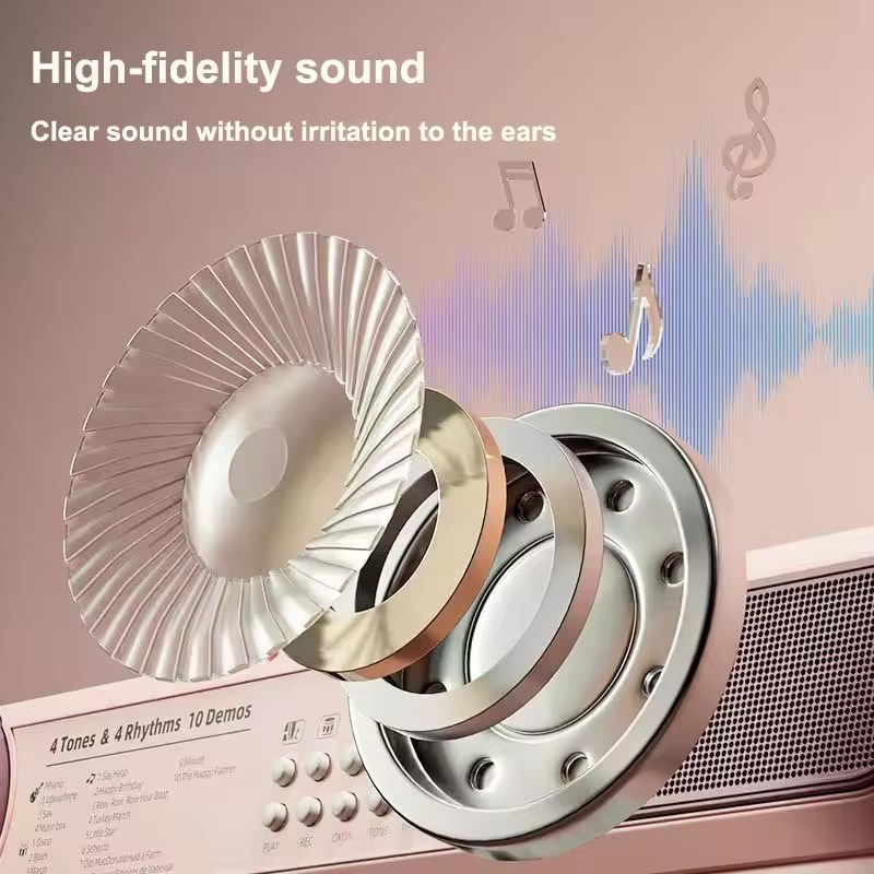 The keyboard features four different tones and rhythms, along with multiple demo songs that introduce children to various musical styles and help develop their sense of rhythm.