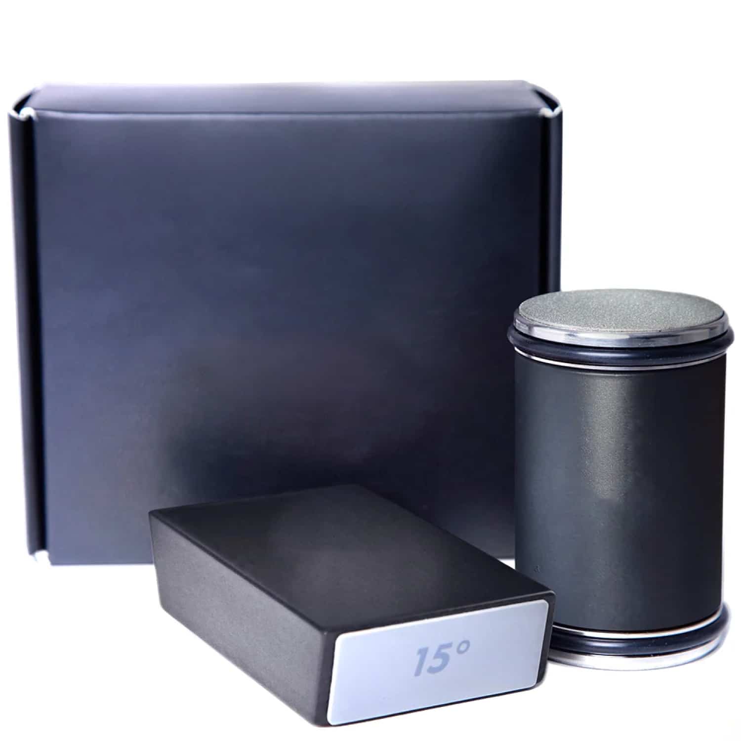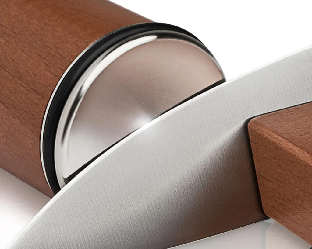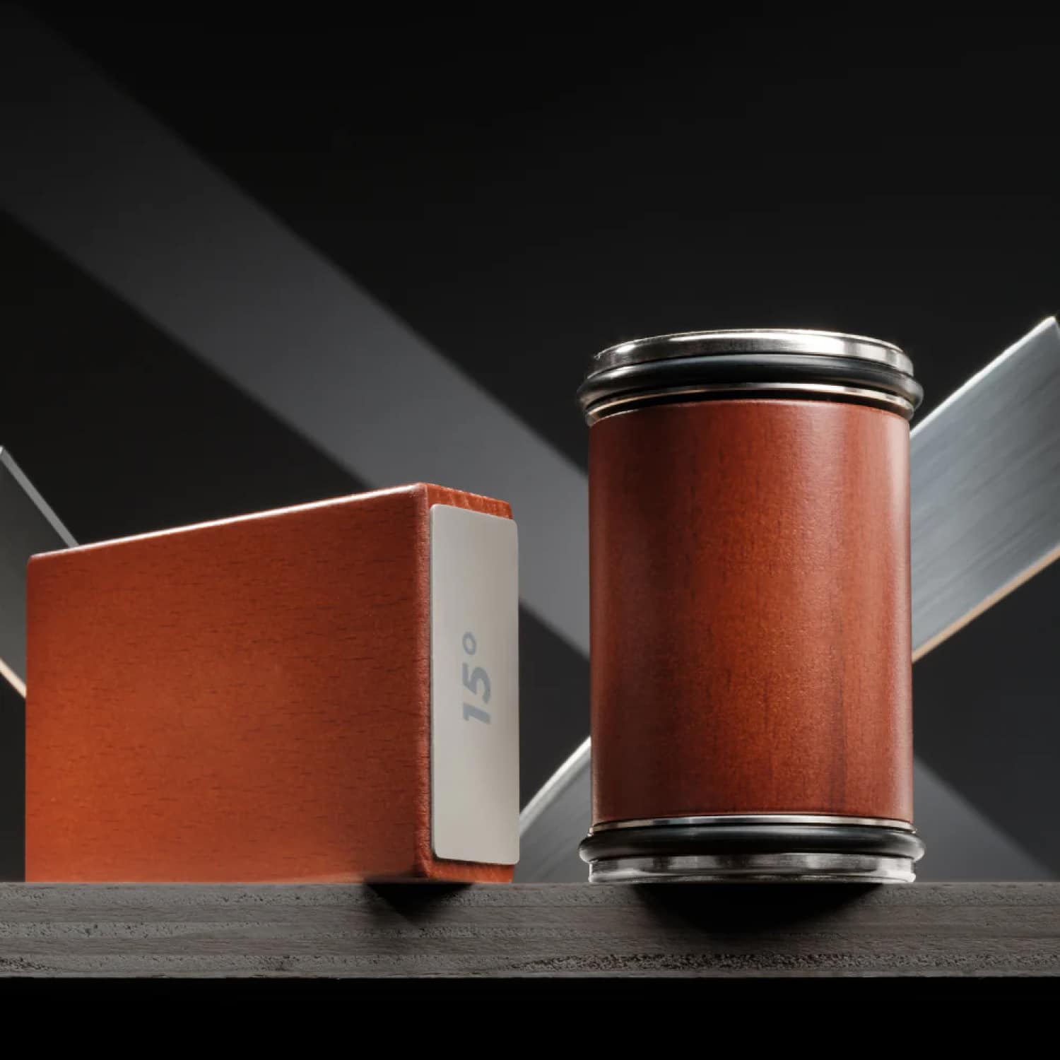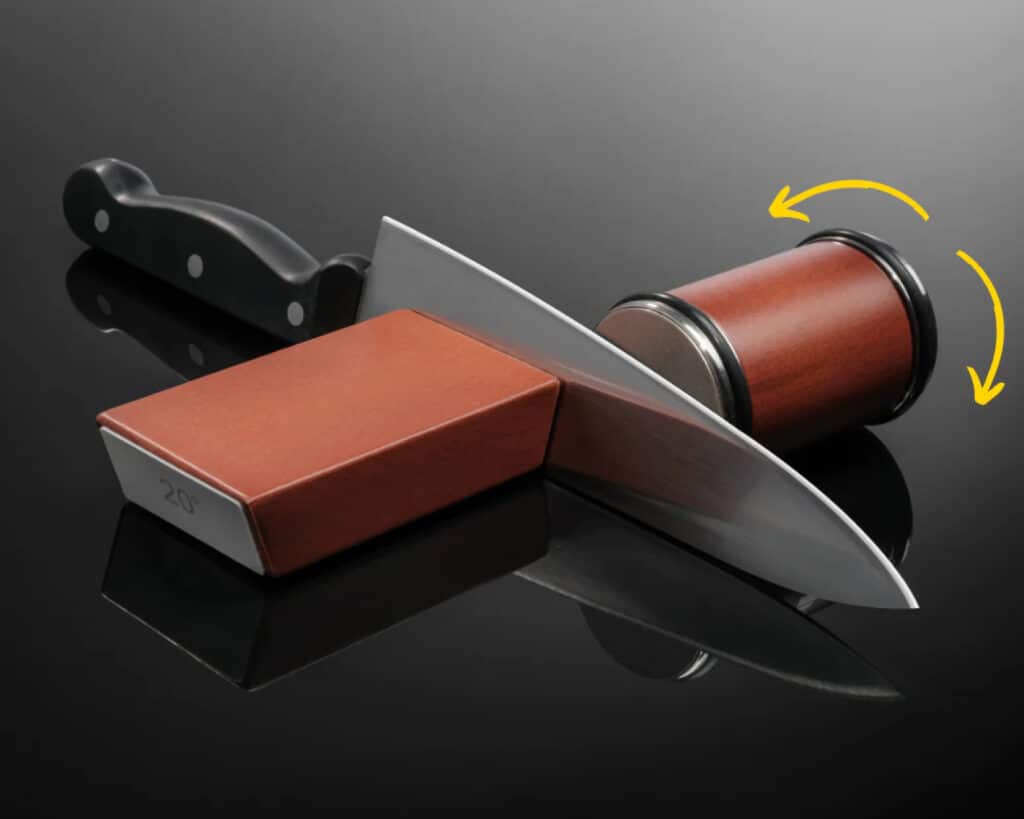 The Sharposty offers two precision angle settings: 15 degrees for Asian-style blades and 20 degrees for Western-style knives. The magnetic guide system maintains these angles perfectly throughout each sharpening session.