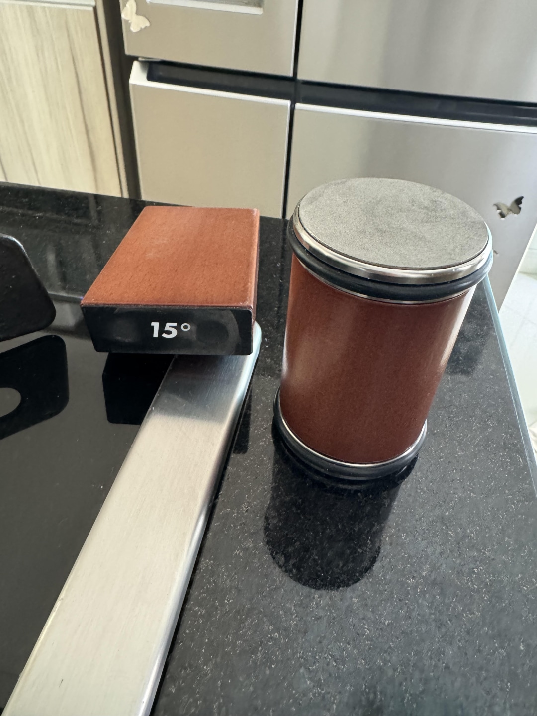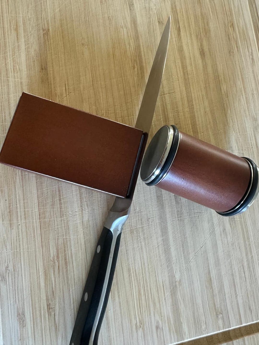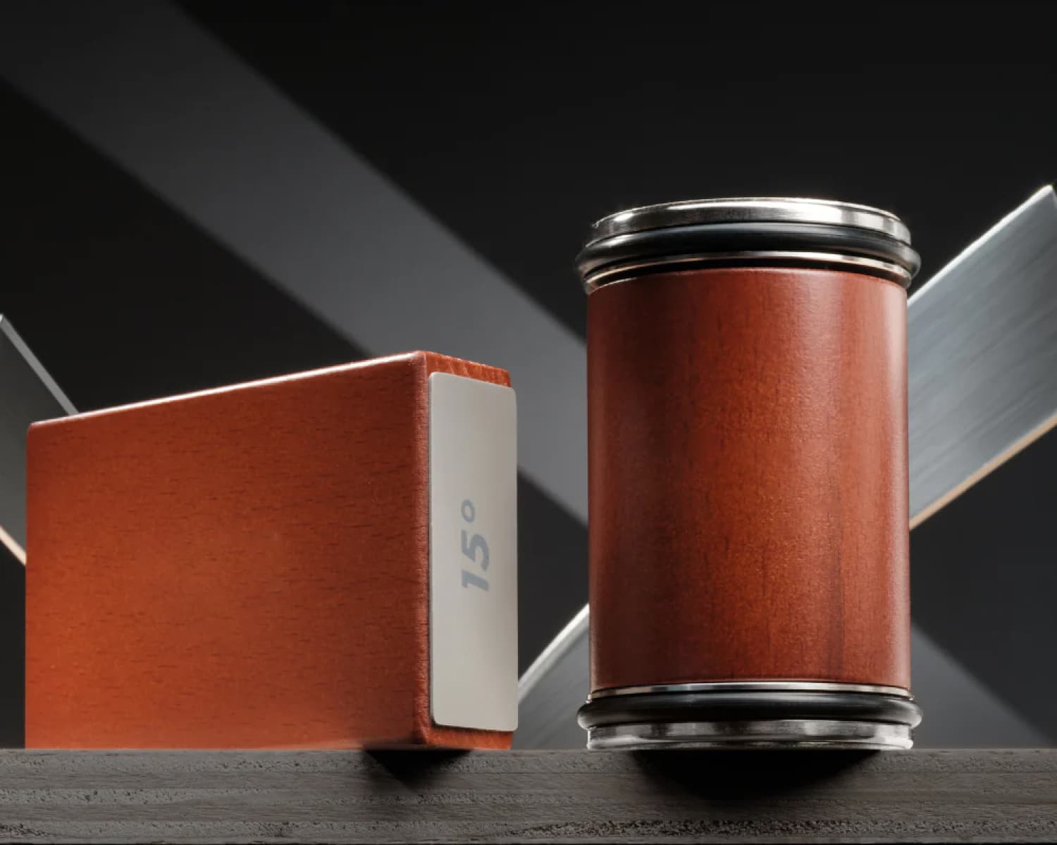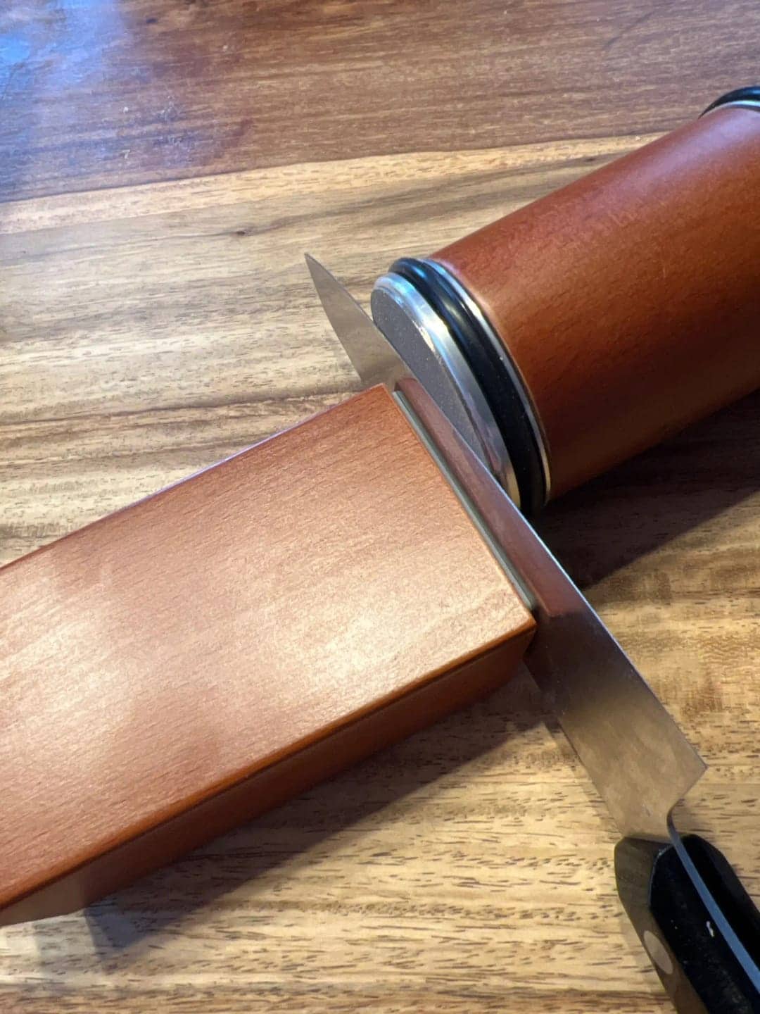 The Sharposty offers two precision angle settings: 15 degrees for Asian-style blades and 20 degrees for Western-style knives. The magnetic guide system maintains these angles perfectly throughout each sharpening session.