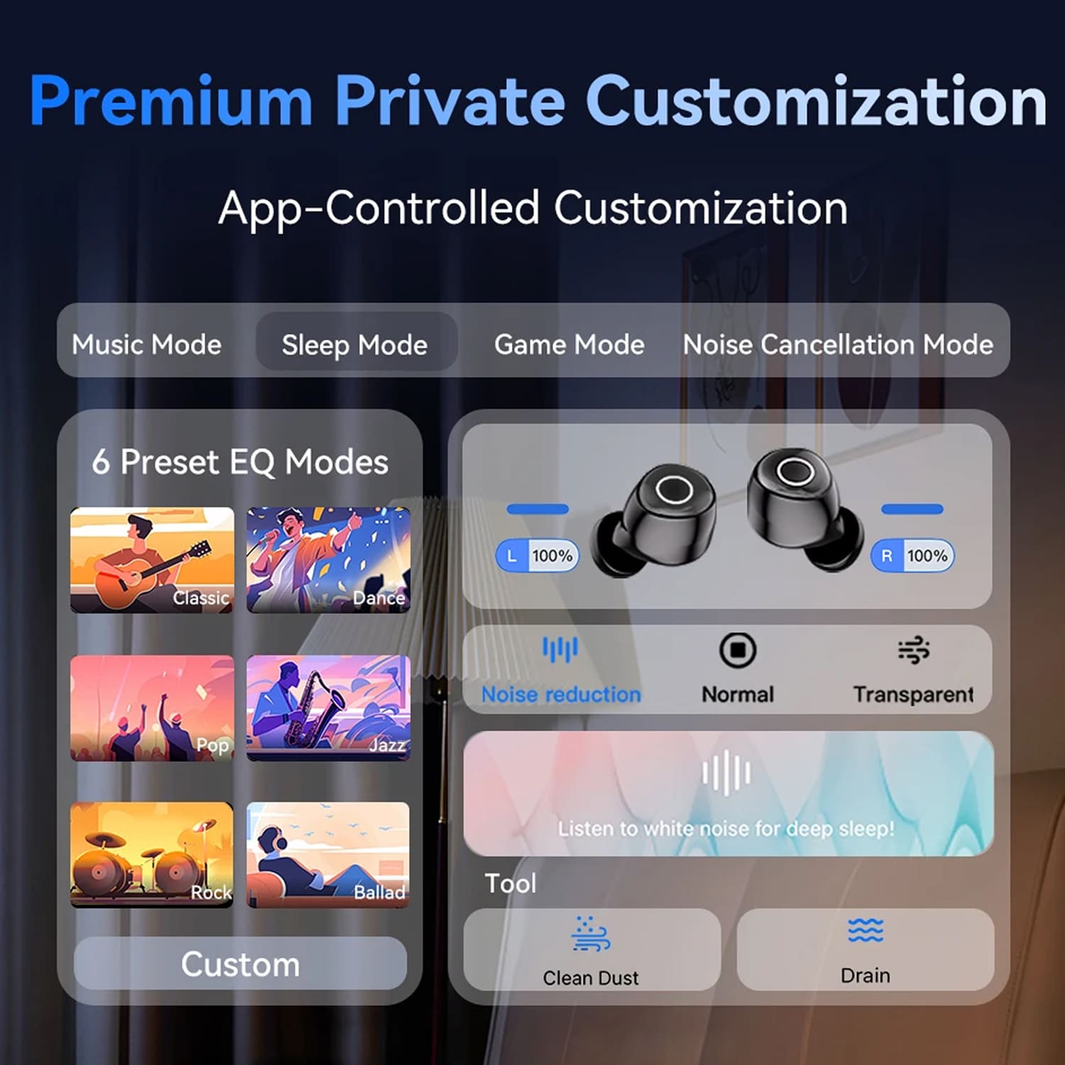 Seamlessly switch between sleep, music, and game modes via the intuitive app. Six preset EQ modes including Classic, Jazz, and Rock ensure perfect audio quality for any activity, whilst dedicated noise cancellation mode maximises focus during work.