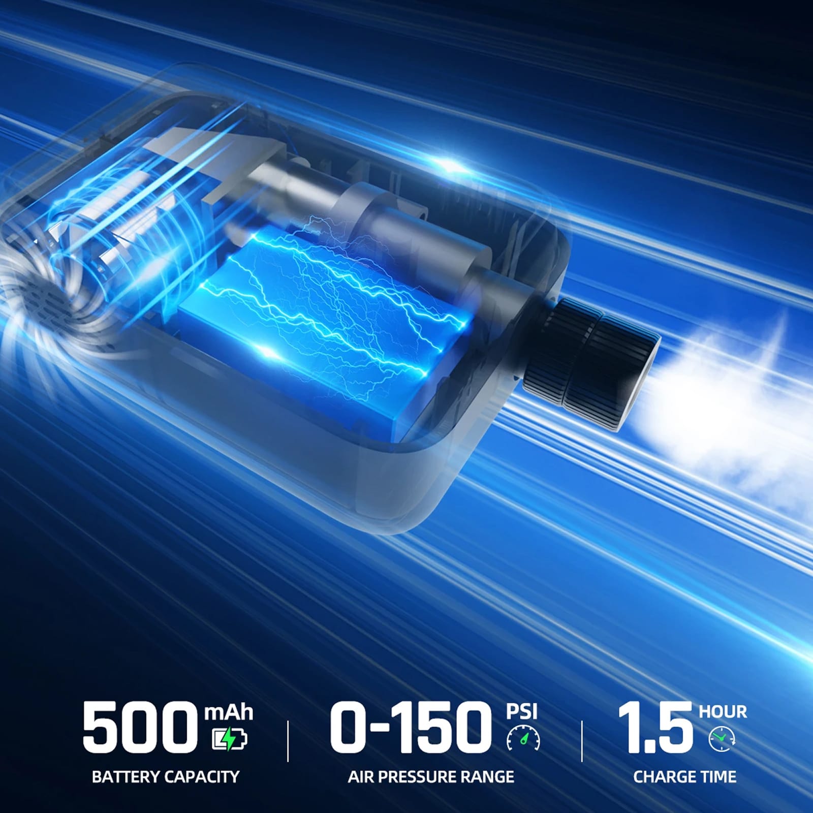 The Type-C charging port allows for quick and convenient recharging. A full charge takes just 1.5 hours, providing up to 250 seconds of continuous use—plenty for multiple tire inflations.